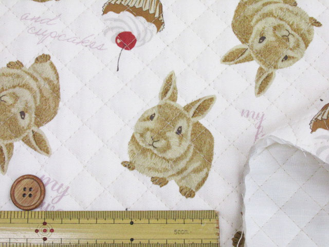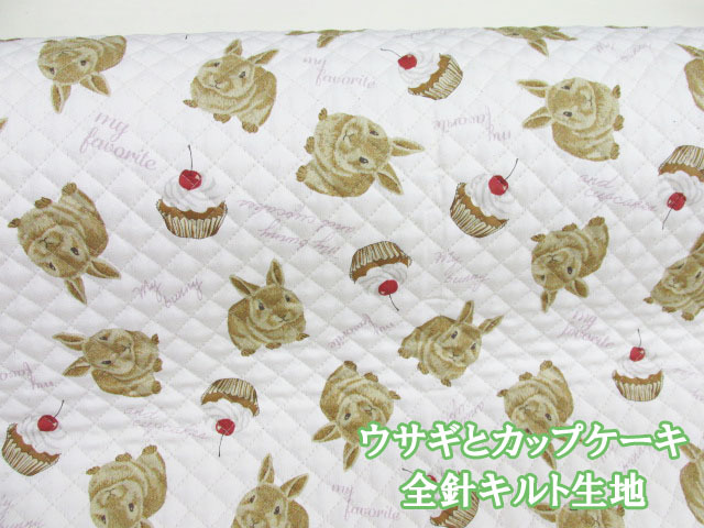 ウサギとカップケーキ うさぎ・ケーキ・動物柄 オックス生地 全針キルト (生成り) [qr9013-2a]