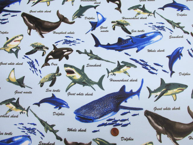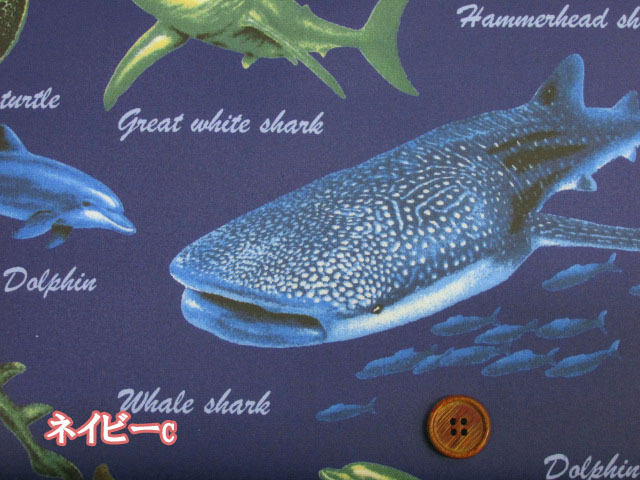 海の生き物 サメ・クジラ・イルカ 海柄 オックス生地 ラミネート つや消し