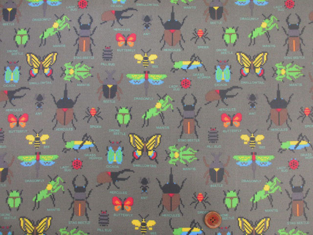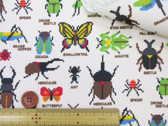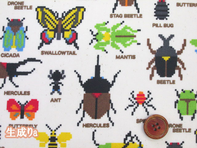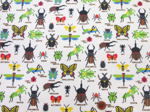 ドット絵 昆虫図鑑 カブトムシ・クワガタ・カマキリ・昆虫柄 オックス生地 ラミネート つや消し