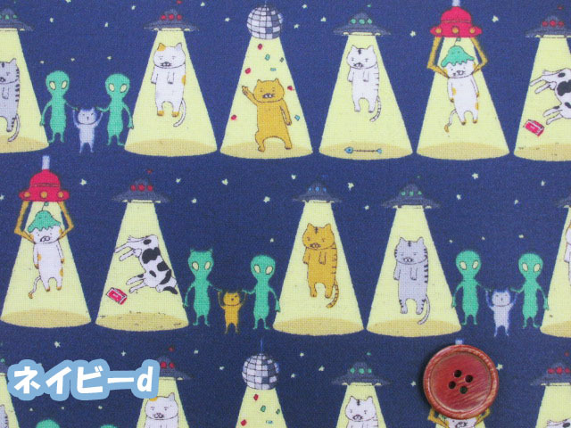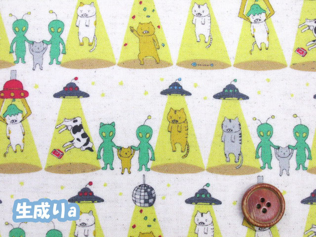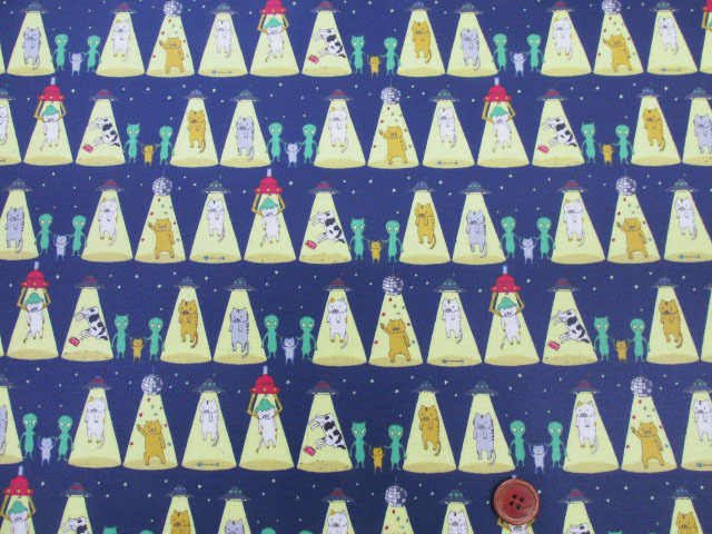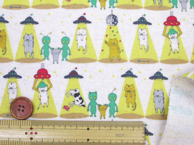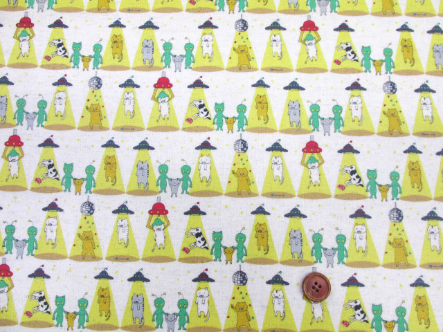 さらわれ猫 UFO 宇宙人 ねこ・ネコ・猫柄 綿麻キャンバス生地 コットンこばやし ラミネート つや消し