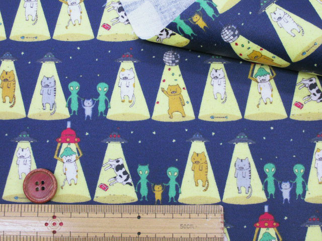 さらわれ猫 UFO 宇宙人 ねこ・ネコ・猫柄 綿麻キャンバス生地 コットンこばやし ラミネート つや消し [lkts7149]