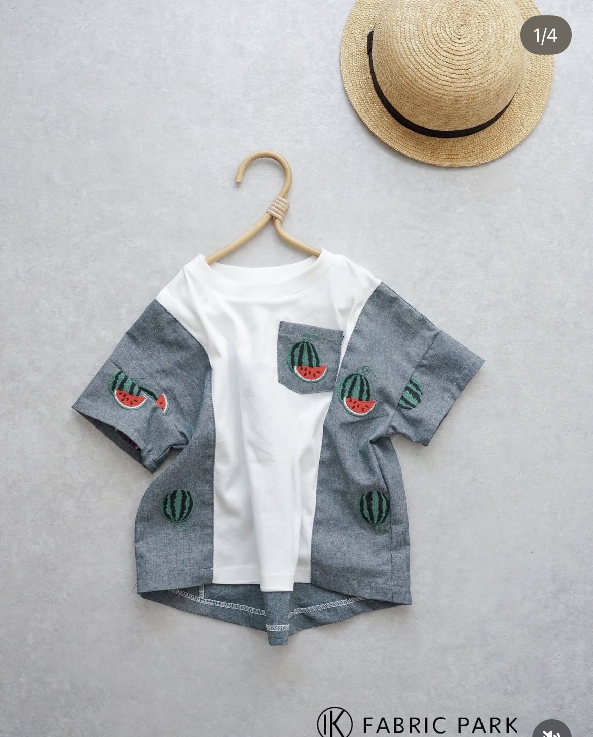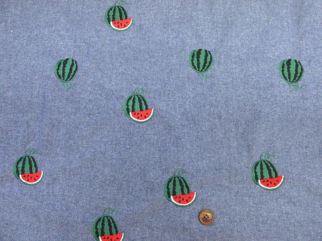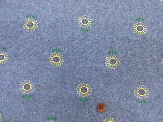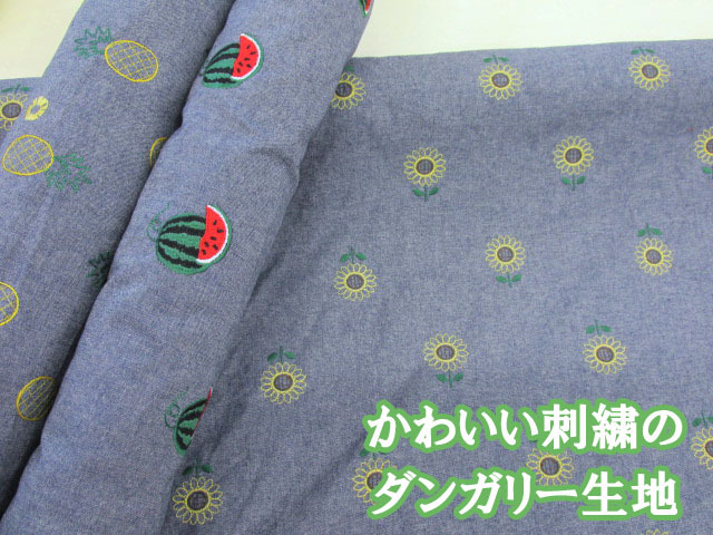 ヒマワリ・スイカ・パイナップルの可愛い刺繍をあしらった綿100% ダンガリー刺繍生地です。