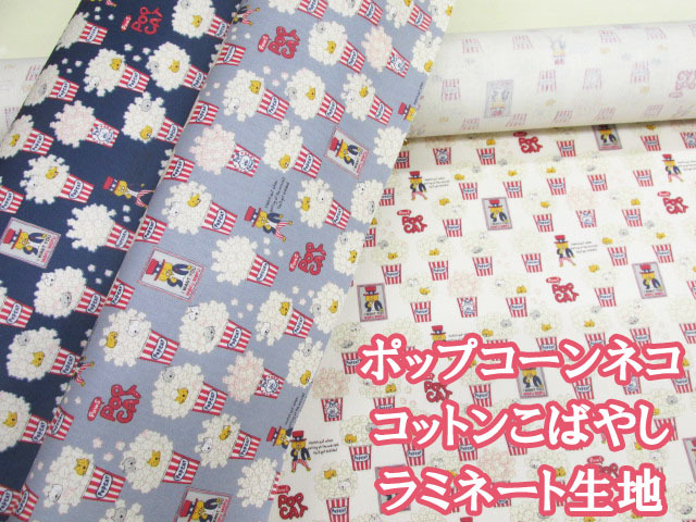 ポップコーンとネコの組み合わせが楽しいポップコーンネコ柄 綿キャンバス ラミネート生地です。