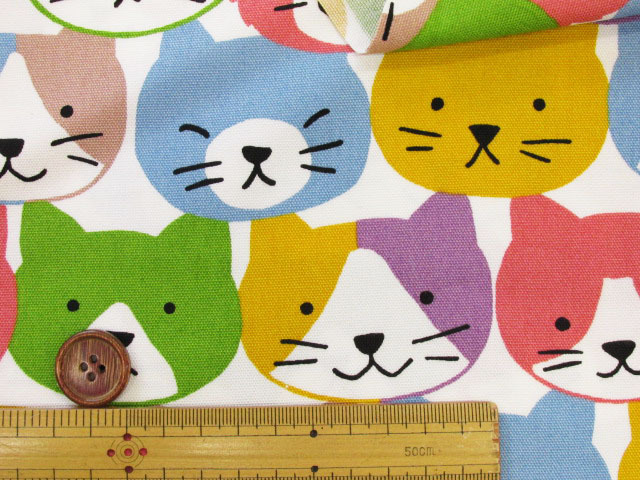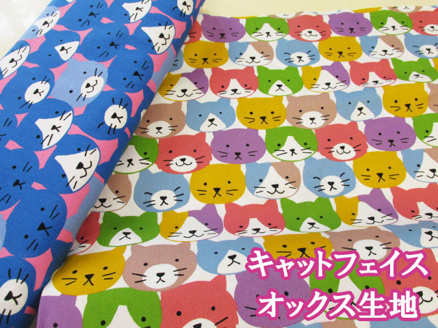 カラフルで楽しい猫たちの表情がいっぱいのキャットフェイス柄 オックス生地です。