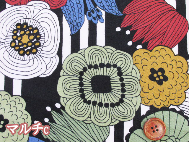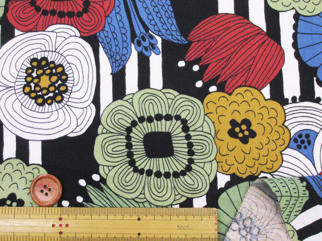 リズミカルに並んだストライプと、大きく咲いた花々の組み合わせが印象的。
