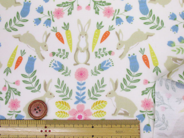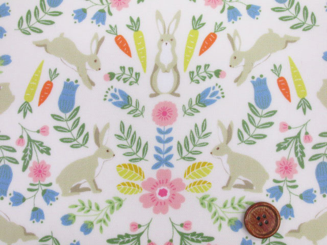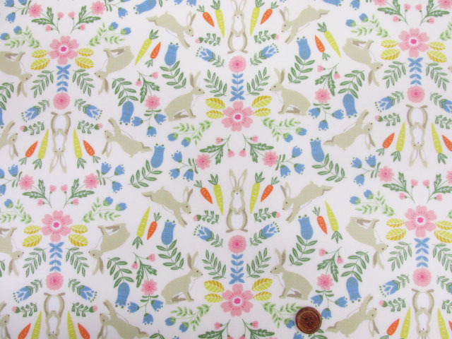 ボタニカルラビット フラワー・ウサギ・花柄 オックス生地 (アイボリー) ラミネート つや消し