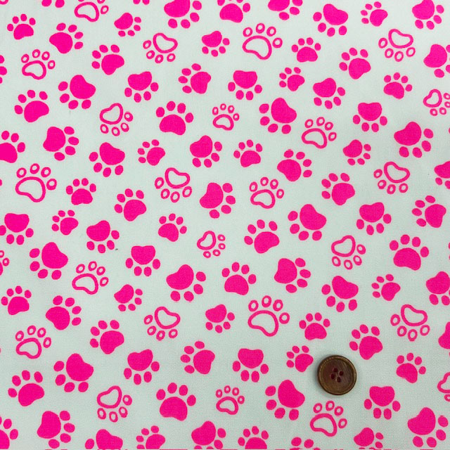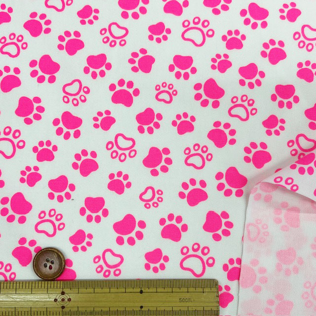 ビビッドに映える蛍光カラーが目を引く犬のあしあと柄 オックス生地(蛍光プリント)です。